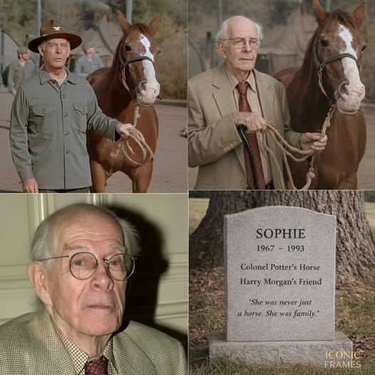 Harry followed, speaking softly. “That was the corral. Colonel Potter’s tent was right over there. The crew used to sneak you apples from craft services.” He pulled one from his pocket. She took it gently — the same way she always had. He told her everything. About the show. About bringing her home after it ended. About Eileen, who loved her until the end. “After Eileen died… you were still here. Every morning. Waiting for me.” Sophie rested her head against his chest. A 78-year-old man. A dying horse. Standing on ground where television history was made. They stayed for hours. Harry walked her slowly around the land, pointing out memories only they shared. When it was time to go, Sophie refused to move. She planted her hooves. Harry smiled through tears. “I know. I don’t want to leave either.” He promised they’d come back. They both knew it wasn’t true. One week later, Sophie could no longer stand. Harry sat with her in the hay, cradling her head in his lap. Before the vet gave the injection, he whispered: “Thank you for Malibu Creek. Thank you for the 4077th. Thank you for being my horse.” Her ear twitched once. Then she was still. Harry buried her beneath an oak tree on his ranch. The marker read: SOPHIE 1967–1993 Colonel Potter’s Horse Harry Morgan’s Friend