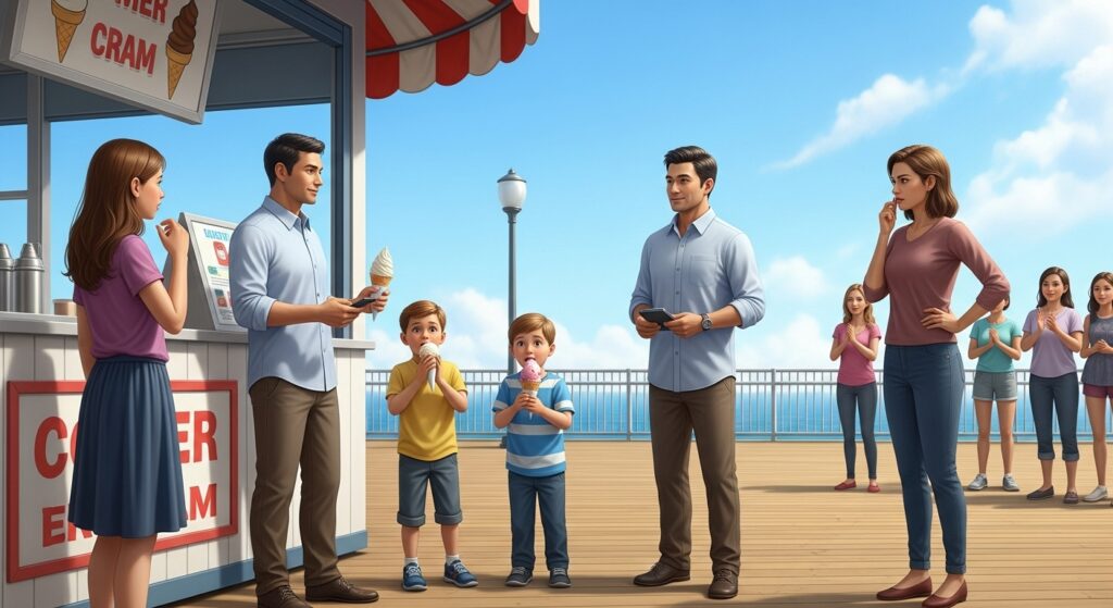 My name is Tasha, I’m 39 years old, and I live in St. Petersburg, Florida. This happened on a humid Saturday afternoon at a busy boardwalk ice cream stand—the kind with a long line, sticky floors, and kids vibrating with sugar anticipation before they even get served. I was standing a few people back when I noticed the woman ahead of me with two kids, maybe eight and ten. They were excited, pointing at flavors, already half-smiling at the freezer. When it came time to order, the woman abruptly shook her head. “No,” she said sharply. “You don’t get ice cream.” The kids froze. The older one asked quietly, “But you said we could…” She cut him off. “I said maybe. You didn’t listen at the beach. Actions have consequences.” The line went awkwardly silent. People shifted. The kids’ faces fell in a way that felt too heavy for something so small. They weren’t screaming or whining—just stunned and embarrassed.