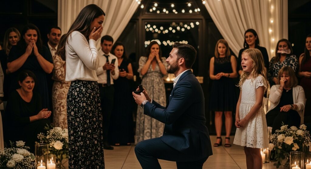 Nathan knelt down, opened a velvet box, and revealed a diamond ring that sparkled under the lights. Guests leaned forward, phones raised, smiles ready.