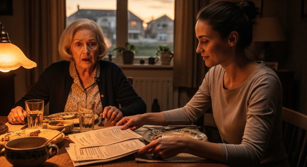 I cooked her favorite meal. We talked about ordinary things. The atmosphere was calm—almost warm. When we finished eating, I cleared the plates and returned to the table with a folder.