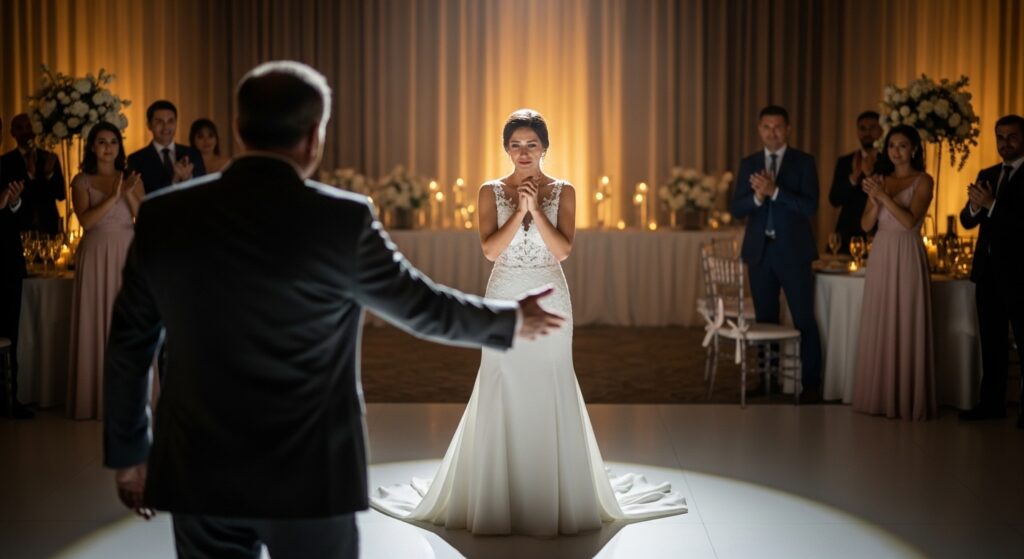 The DJ announced: “And now, for the father-daughter dance!” The spotlight swung to me. Everyone clapped warmly, expecting Dad to step forward. No one came. I stood alone in the light, heart shattering all over again, fighting tears in front of 150 people. Seconds felt like hours.
