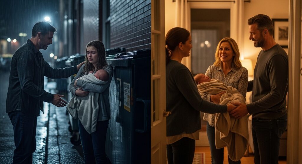 Minutes later, I heard crying — not wind, not an animal. A baby. Behind a dumpster in an alley near our neighborhood, I found a teenage girl — Kara, soaked, shaking, clutching a newborn no more than a few days old. She looked up, terrified: “Please don’t call anyone. They’ll take him from me.”