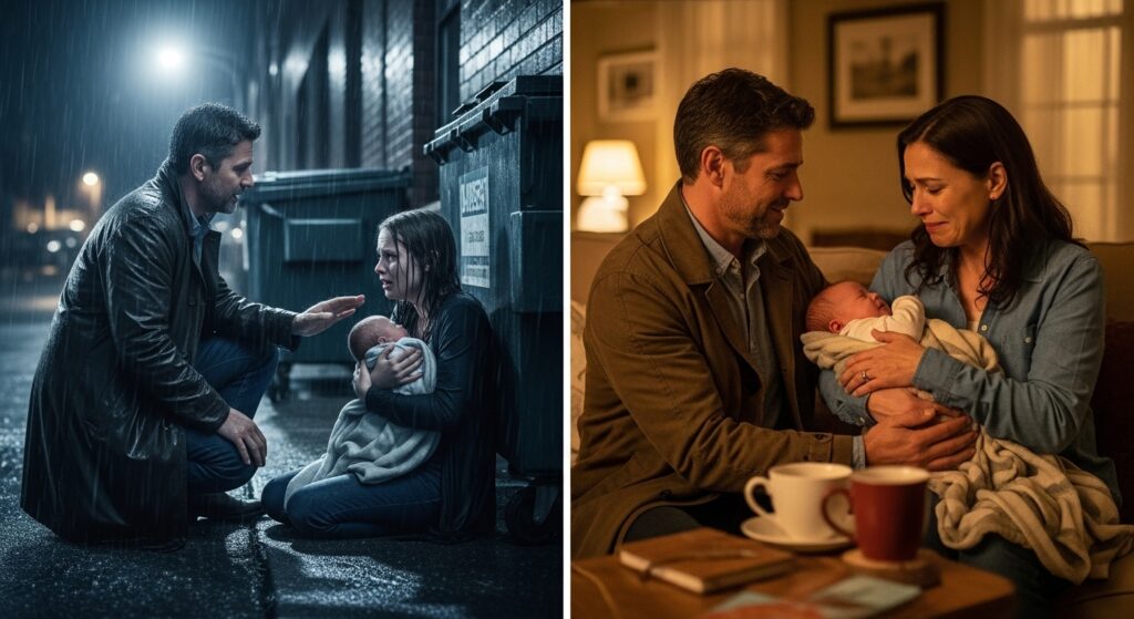 Minutes later, a faint cry cut through the storm — a baby. Behind a dumpster in an alley, I found Kara: 17, soaked, shaking, clutching a newborn no more than days old. She looked up, terrified: “Please don’t call anyone. They’ll take him from me.”