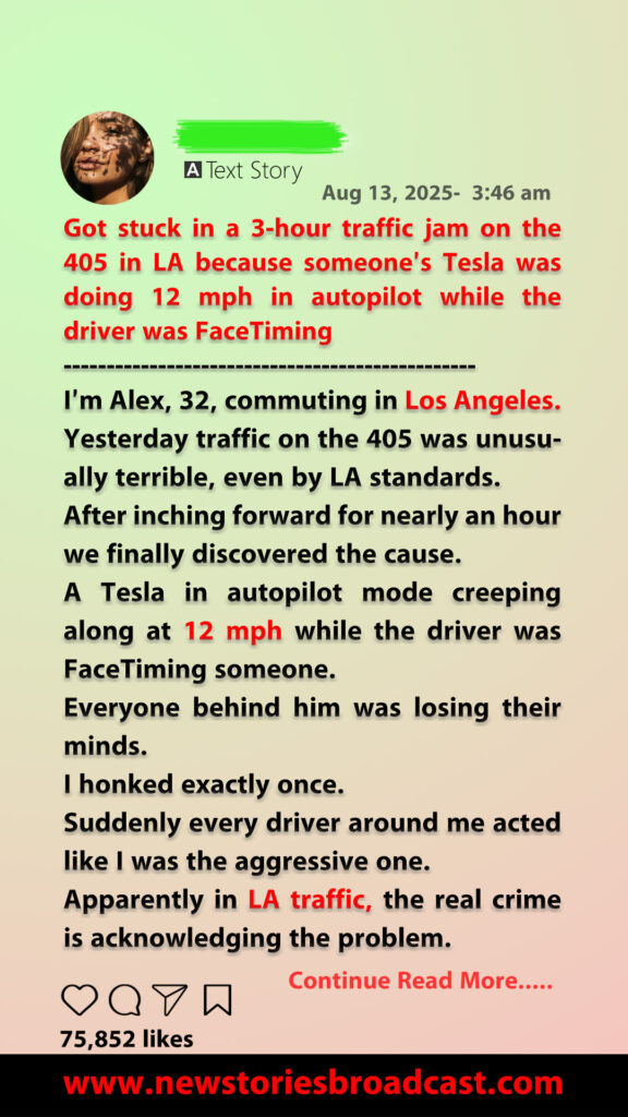 Got stuck in a 3-hour traffic jam on the 405 in LA because someone’s Tesla was doing 12 mph in autopilot while the driver was FaceTiming — I honked exactly once and instantly became the villain