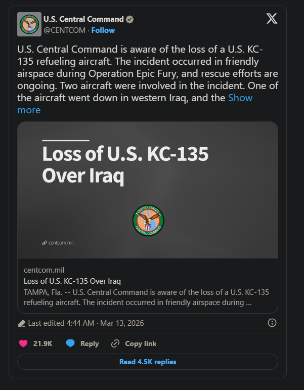 Downed US aircraft: A US KC-135 refuelling aircraft crashed in western Iraq. While the Islamic Resistance in Iraq claimed it shot the aircraft down using air defence systems, US Central Command (CENTCOM) stated the aircraft went down in “friendly airspace” and was not the result of hostile fire.