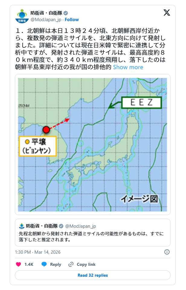 Japanâs Ministry of Defence said on Saturday that the missiles were fired at about 1:34pm local time (04:34 GMT) in a northeastern direction, according to a statement posted on X.