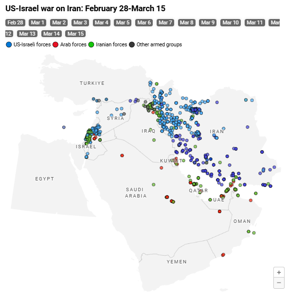 The map below highlights a day-by-day breakdown of the recorded events since February 28. Click on the tabs to view each day, or click on the circles to access more information about each incident.