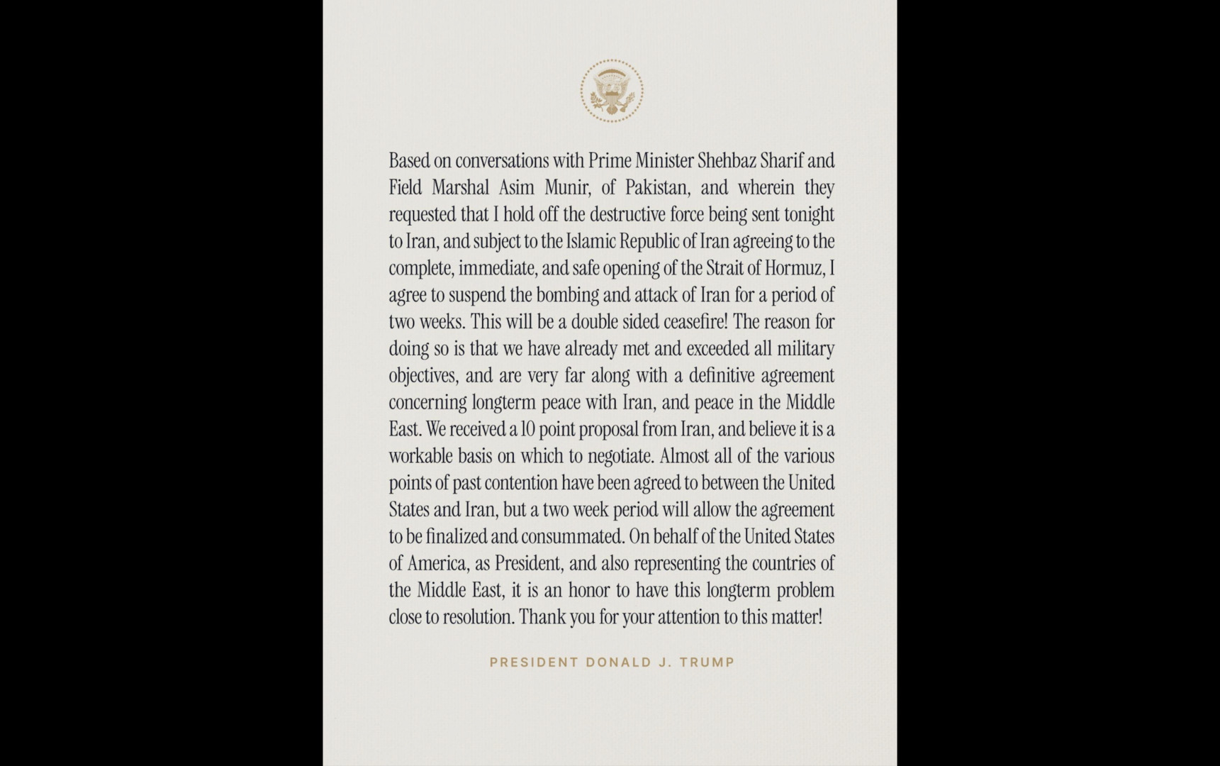 âBased on conversations with Prime Minister Shehbaz Sharif and Field Marshal Asim Munir, of Pakistan, and wherein they requested that I hold off the destructive force being sent tonight to Iran, and subject to the Islamic Republic of Iran agreeing to the COMPLETE, IMMEDIATE, and SAFE OPENING of the Strait of Hormuz, I agree to suspend the bombing and attack of Iran for a period of two weeks,â Trump wrote.