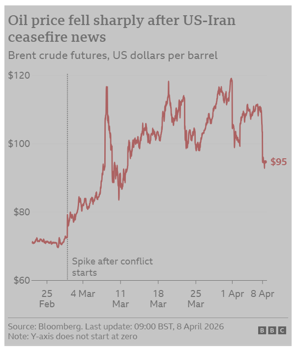 Global oil prices have fallen sharply and stock markets have jumped after the US and Iran agreed to a conditional two-week ceasefire deal that includes the reopening of the key Strait of Hormuz waterway.