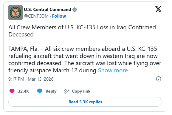 On March 13, US CENTCOM announced all six crew members were killed when a US refuelling aircraft crashed in western Iraq.