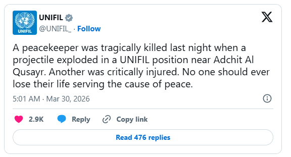 The United Nations Interim Force in Lebanon (UNIFIL) has confirmed one of its peacekeepers was killed in the countryâs south, as fighting between Israeli troops and the Hezbollah group intensifies amid Israelâs invasion.