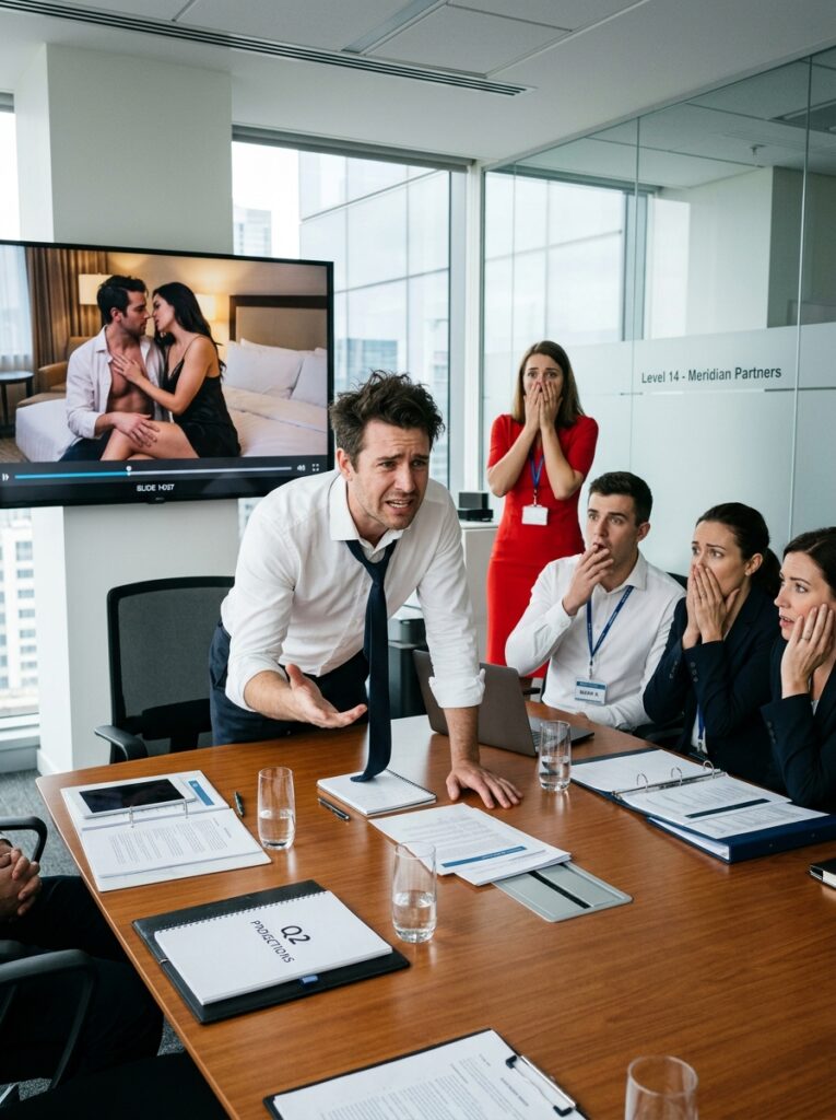 Instead of the polished charts and graphs, the intimate hotel room video began playing in crystal-clear high definition. Emiliano’s voice filled the speakers — not the professional tone he was using now, but the raw, laughing, intimate tone from the video. His face appeared large on the screen, disheveled, laughing as he pulled Camila closer, her hands on his chest, their bodies entangled in ways that left nothing to the imagination. The audio was unmistakable: his groans, her whispers, the casual way he said her name like it was a secret he owned.