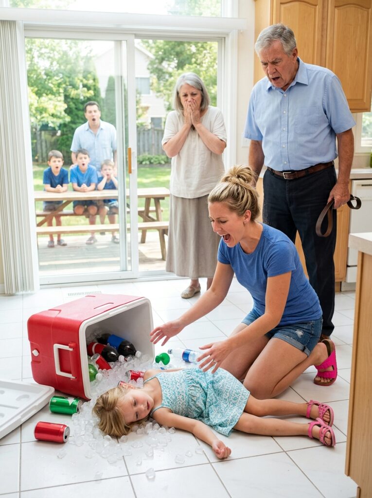 I stared at my mother while my little girl lay unconscious on the cold tile, blood slowly spreading through her soft blonde hair. The backyard music kept playing — some cheerful country song about summer and good times — as if the party was still happening instead of collapsing into horror.