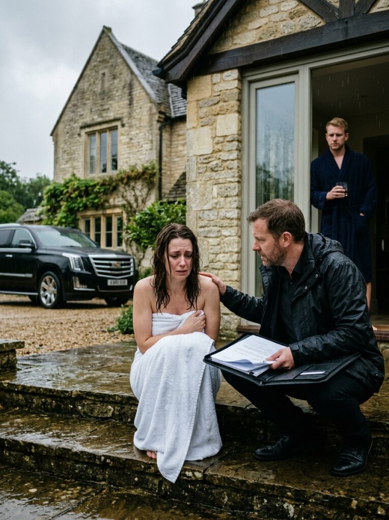 Because while she stood barefoot on those cold steps in the rain, clutching a towel around her pregnant body, the wife they thought they could discard had no idea that the black Escalade pulling through the gate belonged to her brother — the man who managed the family trust — and that the nightmare they had just started was about to end in t